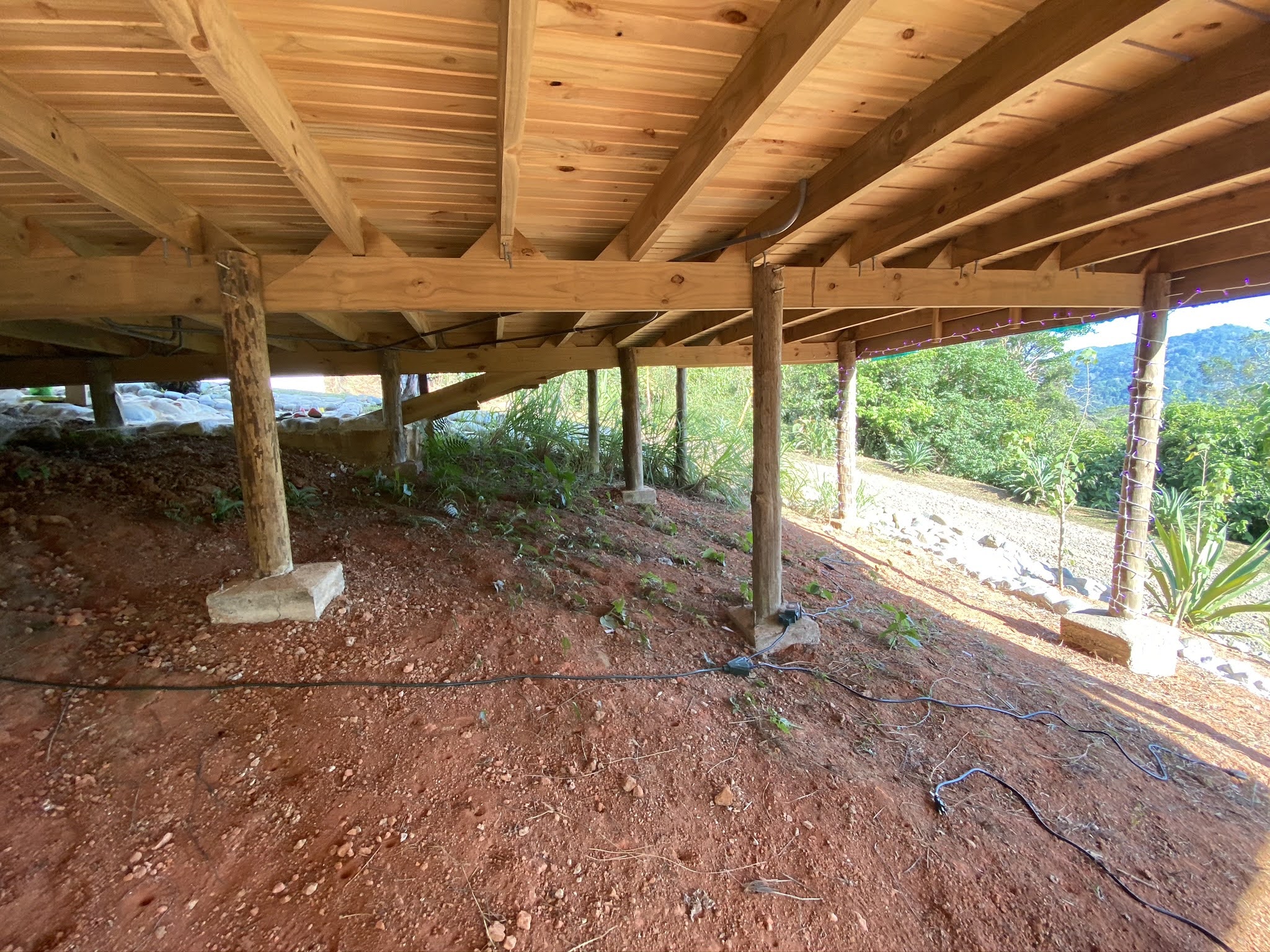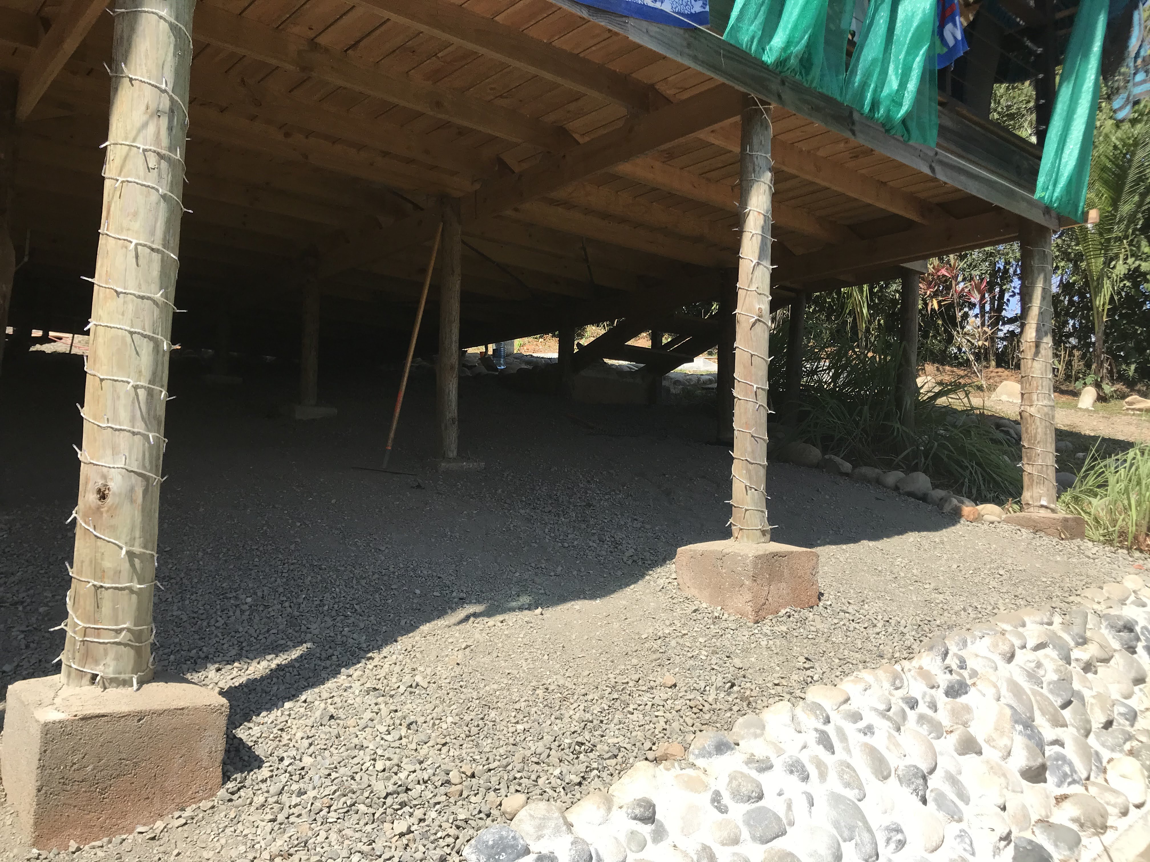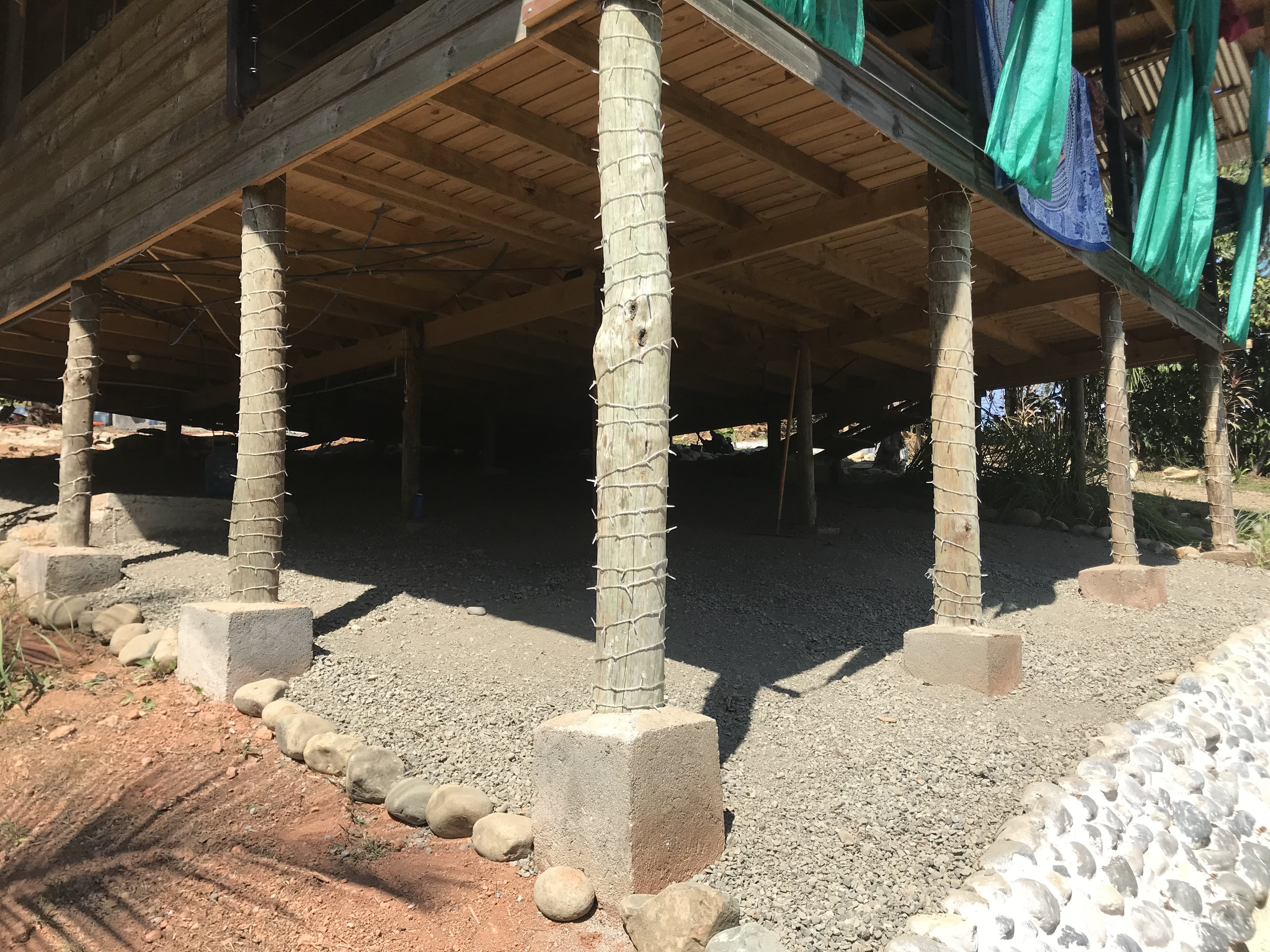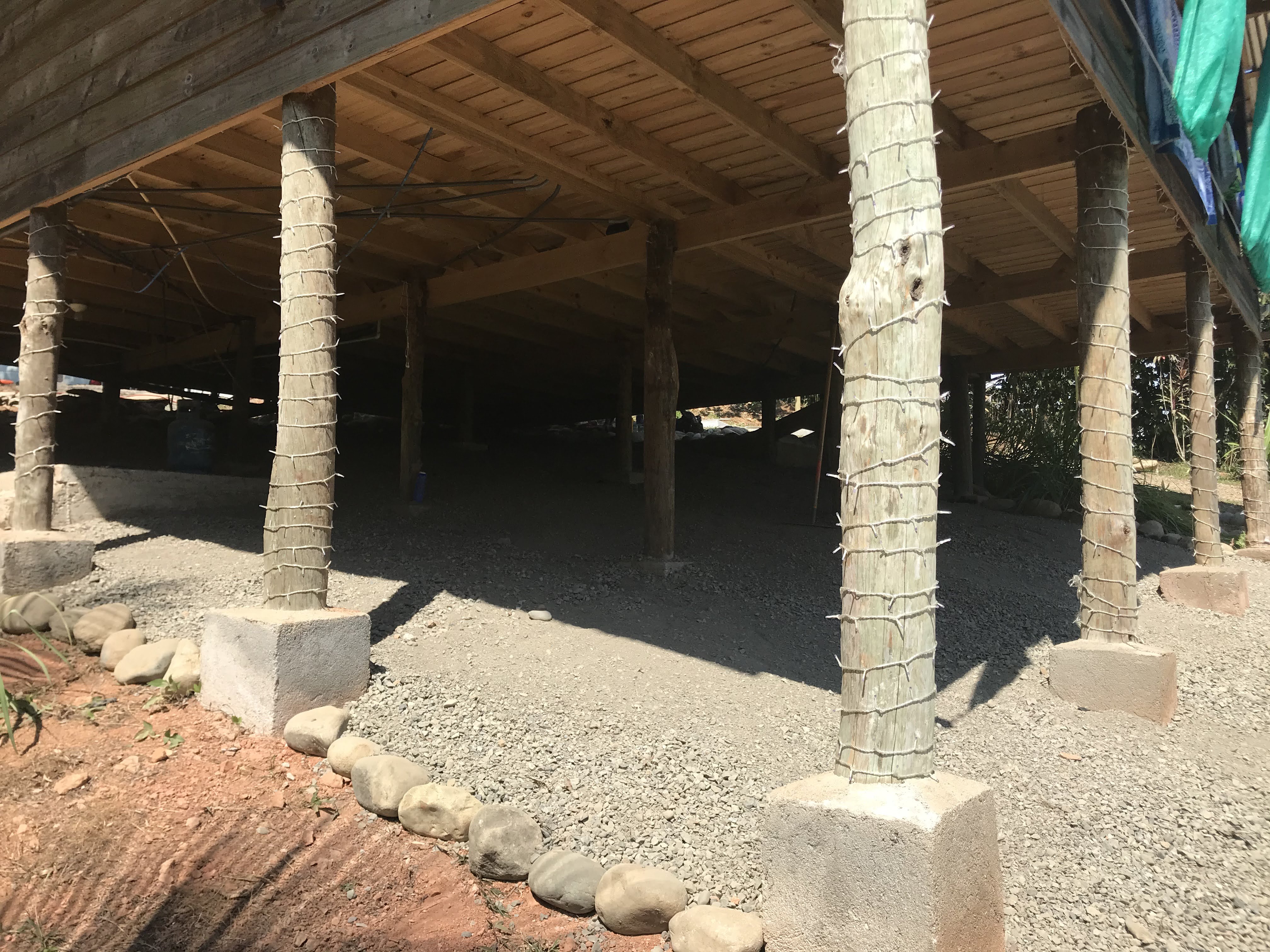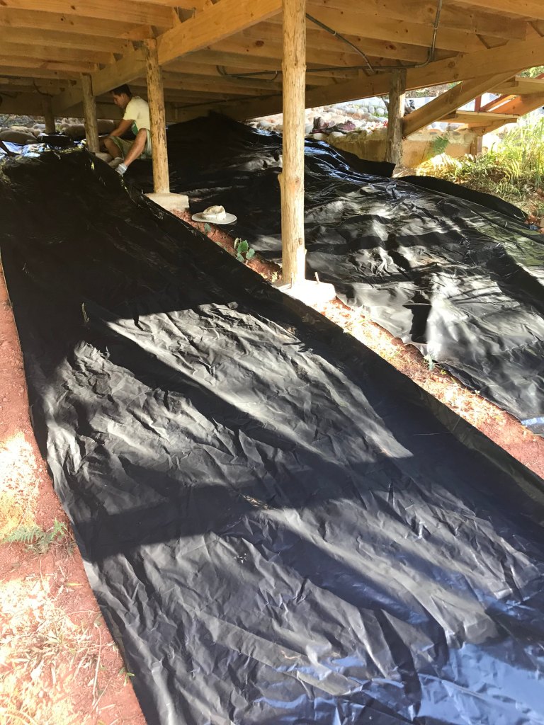 - To prevent a jungle-like habitat from forming underneath the house, plastic sheets were laid over the dirt and then covered with gravel