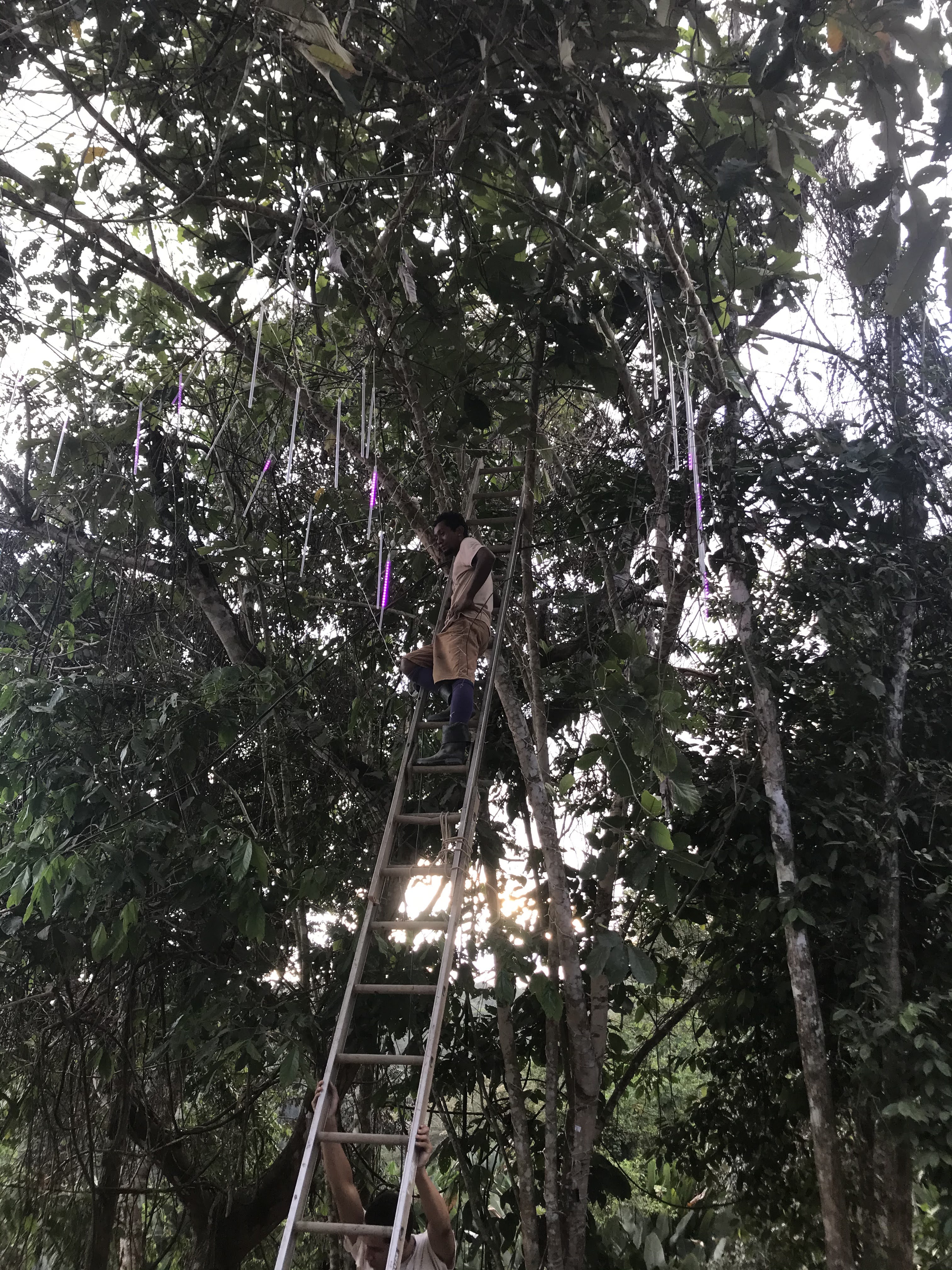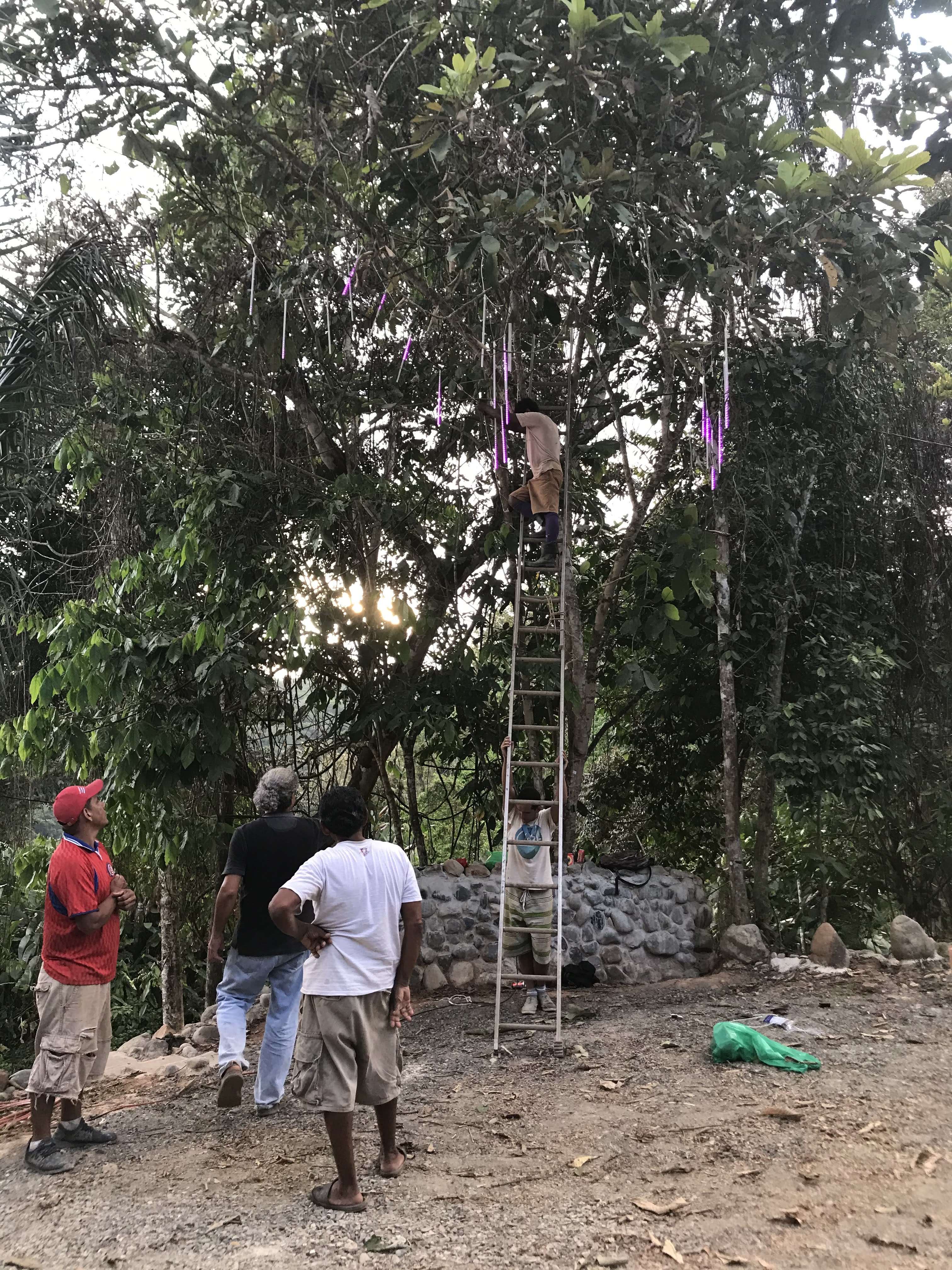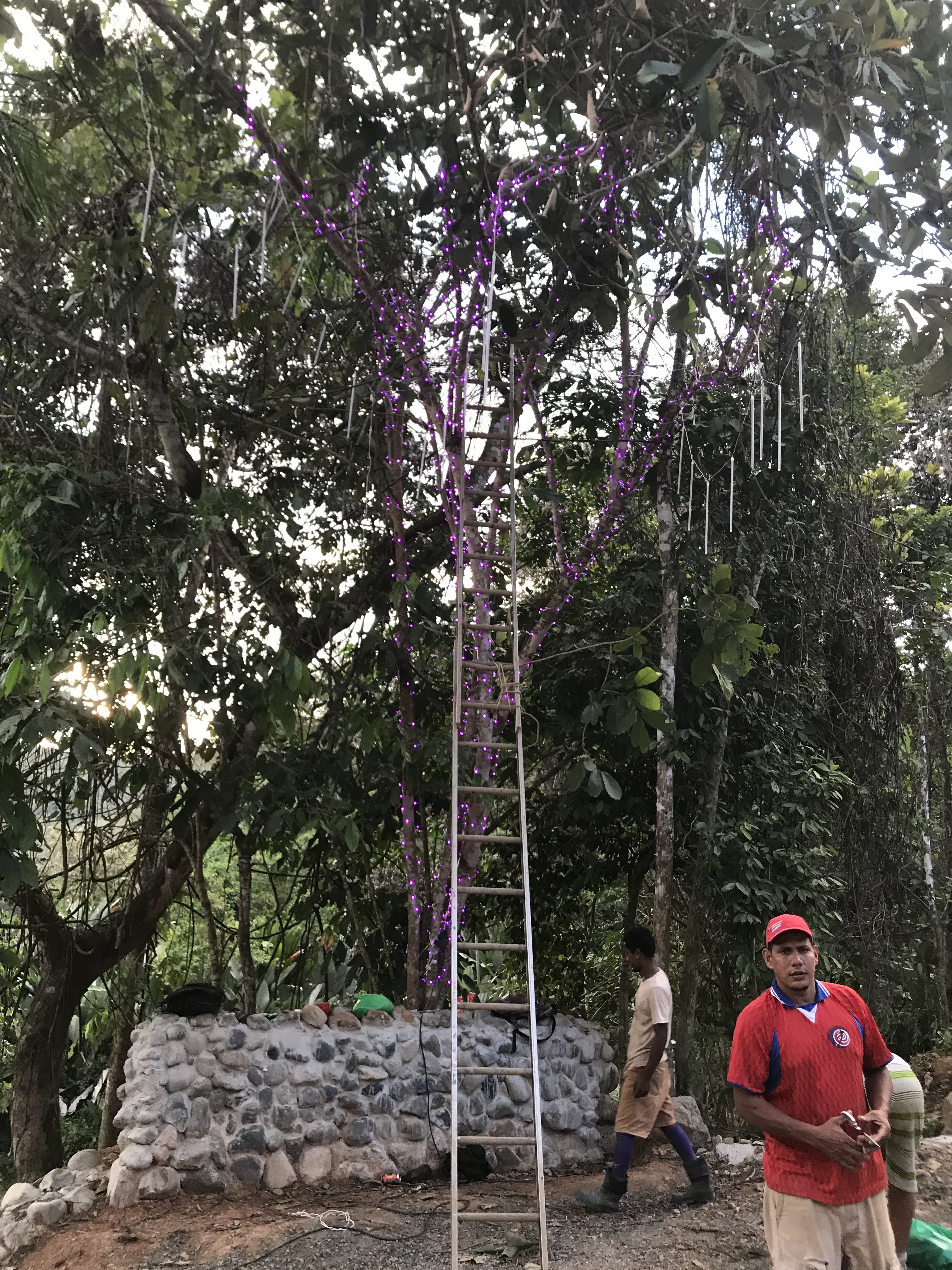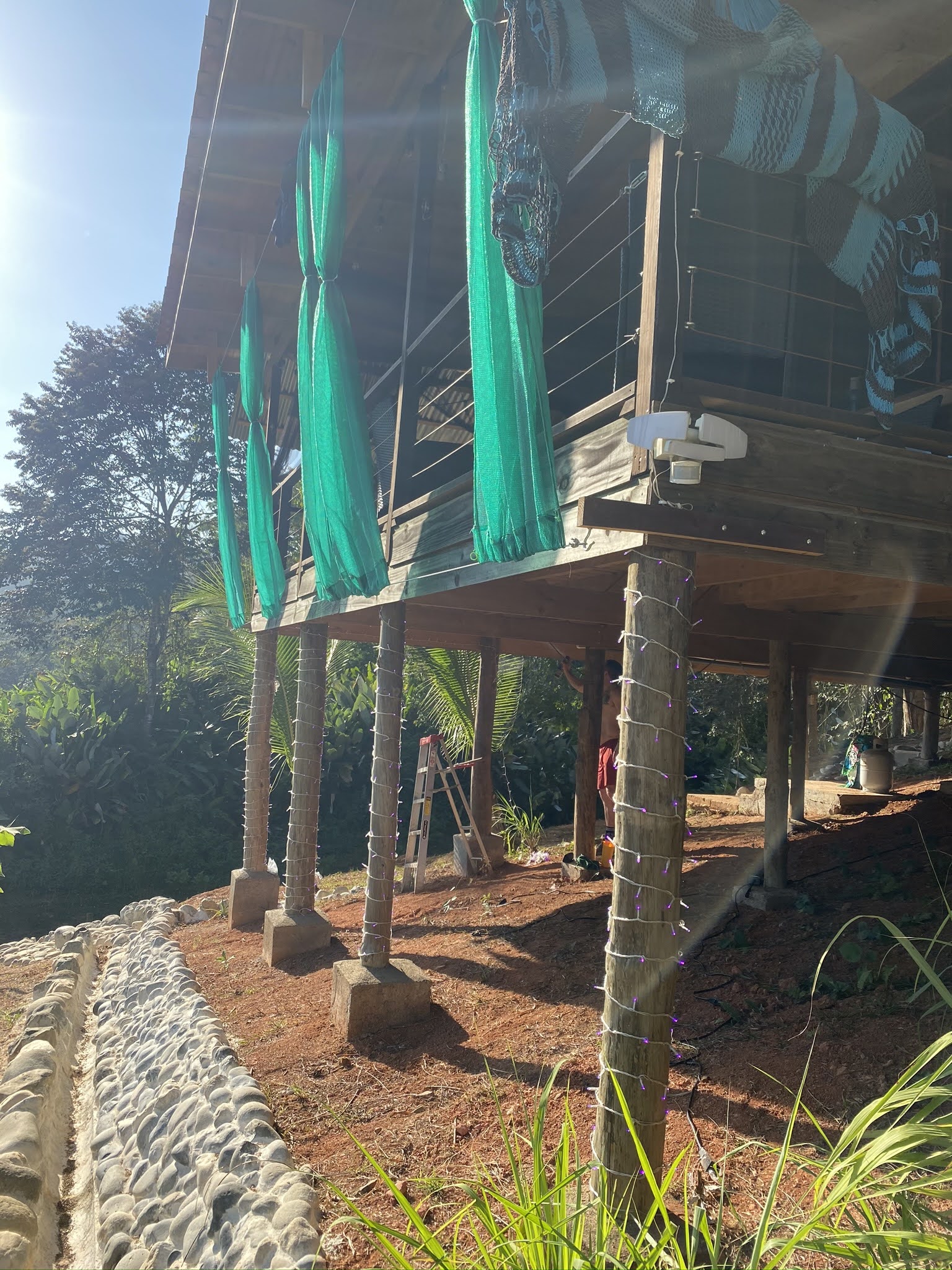 - LED lights were hung in the trees in the parking area behind the house and also wrapped around the support column posts of the house