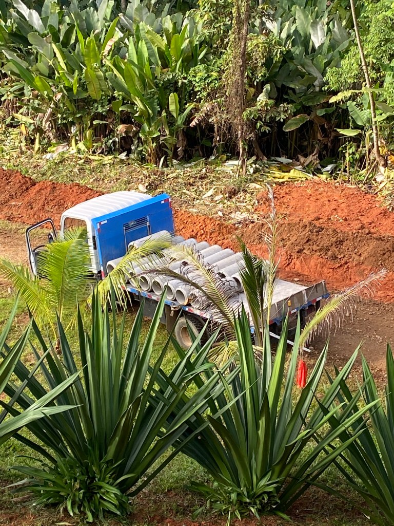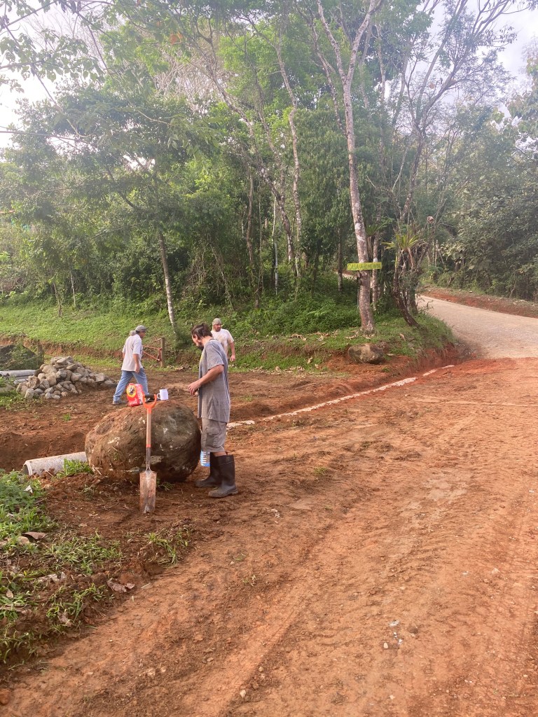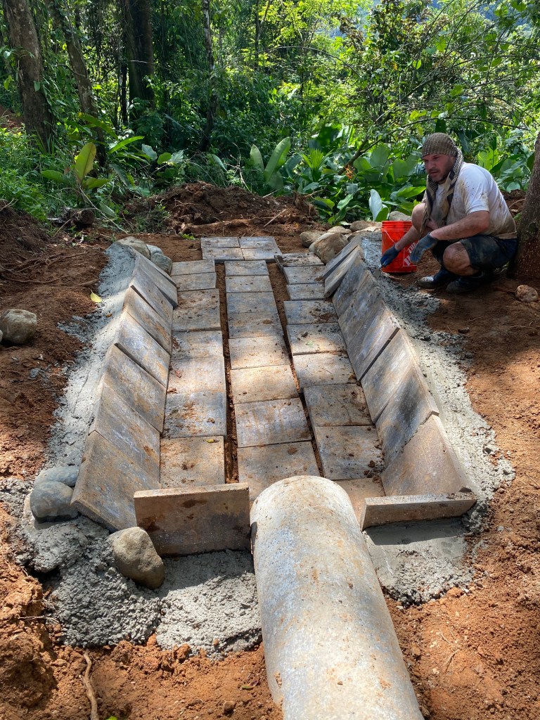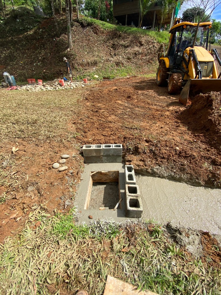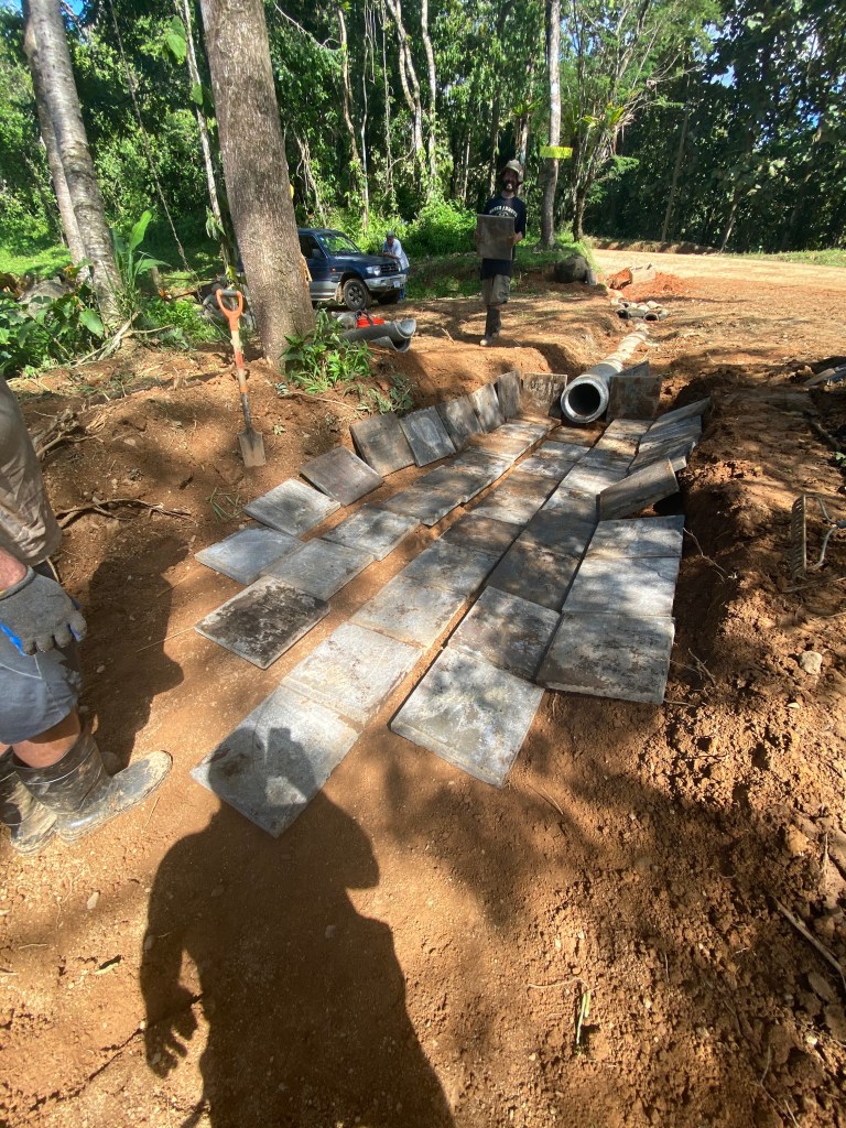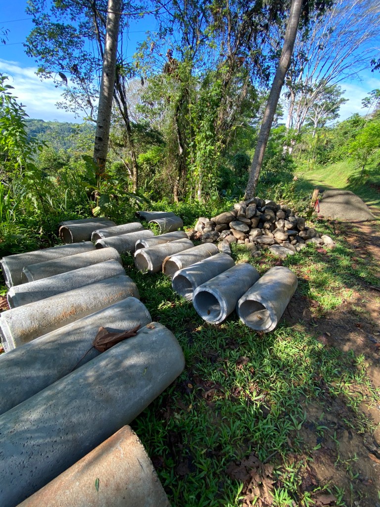At the end of this trench line, a concrete connector box was constructed so that the alcanterias could round a corner and turn 90 degrees to keep pushing the water further down to lower levels of the property. Our original plan was to continue to move the water toward the jungle and let the water just flow naturally. When this plan was brought to the attention of our neighbor, we had to make a significant adjustment. Our original plan, as logical and cost effective as it was, was deemed unacceptable to our neighbor, as the assumption was that the rainwater coming from our property would contaminate the water from a natural spring that is very close. This is not the case, as there is no effluent associated with this drainage coming from our land, but the situation was not worth fighting about and jeopardizing a relationship with our immediate neighbor and colleague, therefore the line of alcanterias must be extended for a significant distance beyond our original plans. In January of 2021, a total of sixty-two (62) 12-inch alcanterias were installed. As of this writing, it is estimated that 30 additional alcanterias are required to complete this section of drainage. This is a significant cost for additional materials, labor, and backhoe machine rental, but that is how life is sometimes.