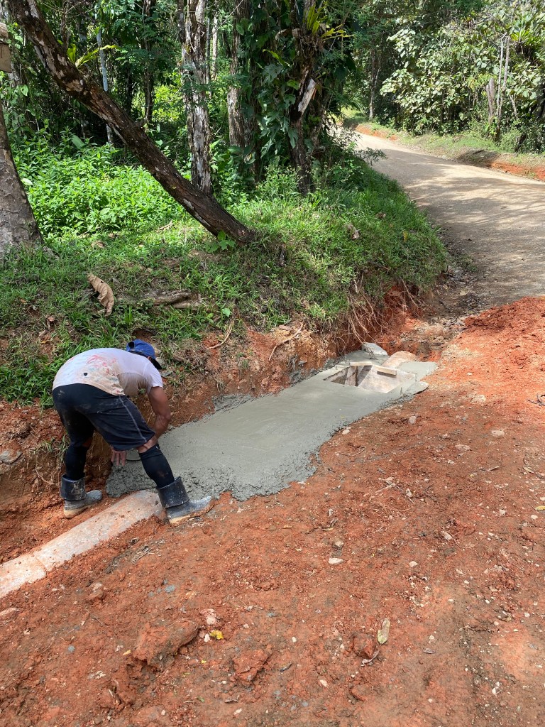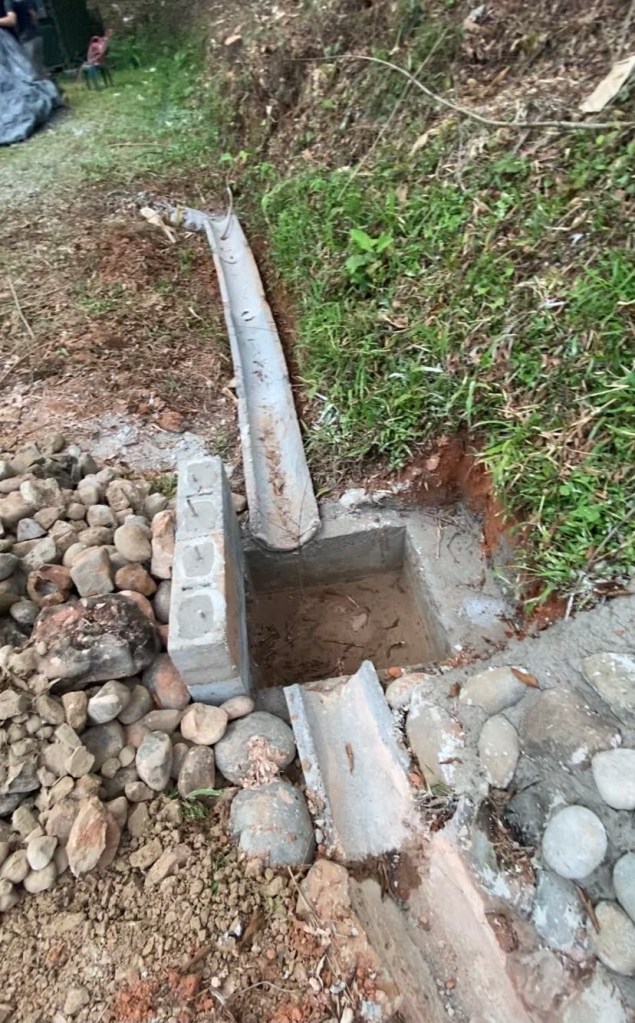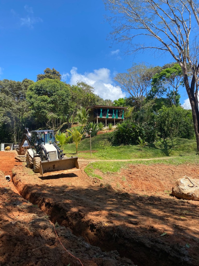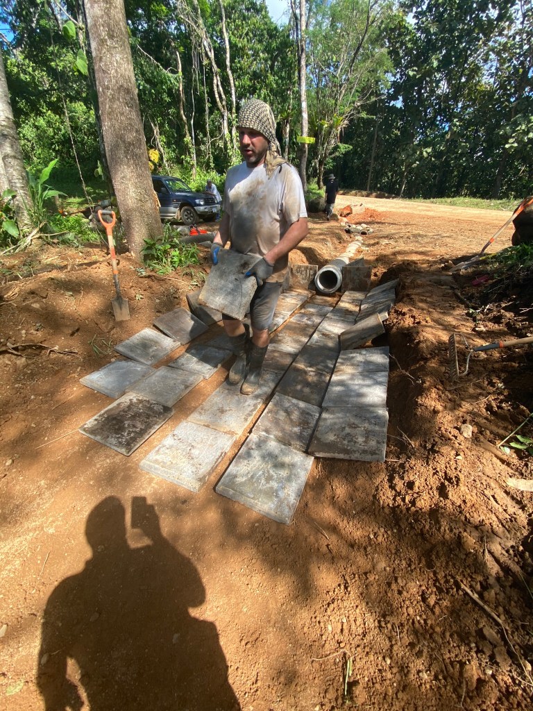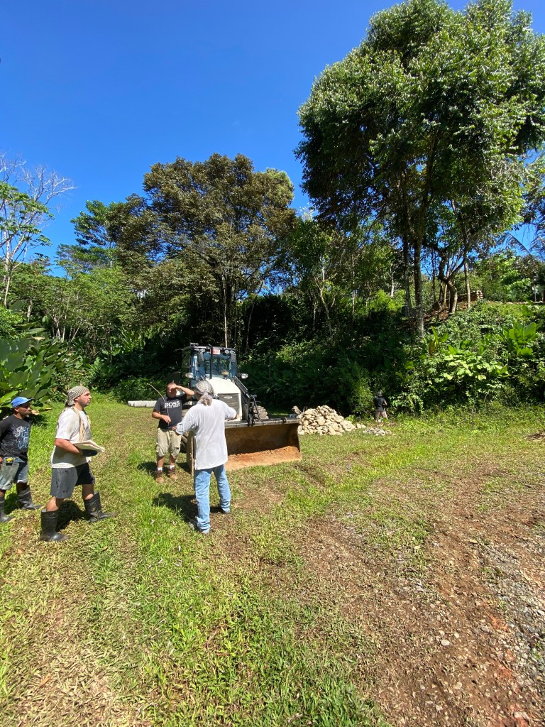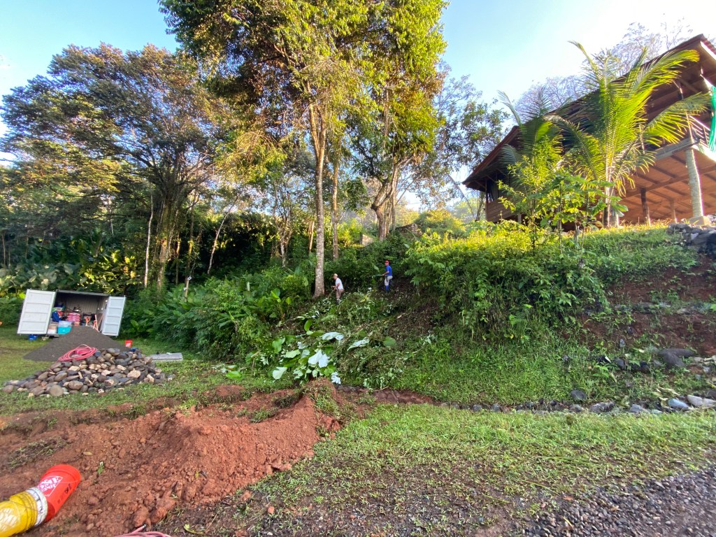 At the end of this trench line, a concrete connector box was constructed so that the alcanterias could round a corner and turn 90 degrees to keep pushing the water further down to lower levels of the property. Our original plan was to continue to move the water toward the jungle and let the water just flow naturally. When this plan was brought to the attention of our neighbor, we had to make a significant adjustment. Our original plan, as logical and cost effective as it was, was deemed unacceptable to our neighbor, as the assumption was that the rainwater coming from our property would contaminate the water from a natural spring that is very close. This is not the case, as there is no effluent associated with this drainage coming from our land, but the situation was not worth fighting about and jeopardizing a relationship with our immediate neighbor and colleague, therefore the line of alcanterias must be extended for a significant distance beyond our original plans. In January of 2021, a total of sixty-two (62) 12-inch alcanterias were installed. As of this writing, it is estimated that 30 additional alcanterias are required to complete this section of drainage. This is a significant cost for additional materials, labor, and backhoe machine rental, but that is how life is sometimes.