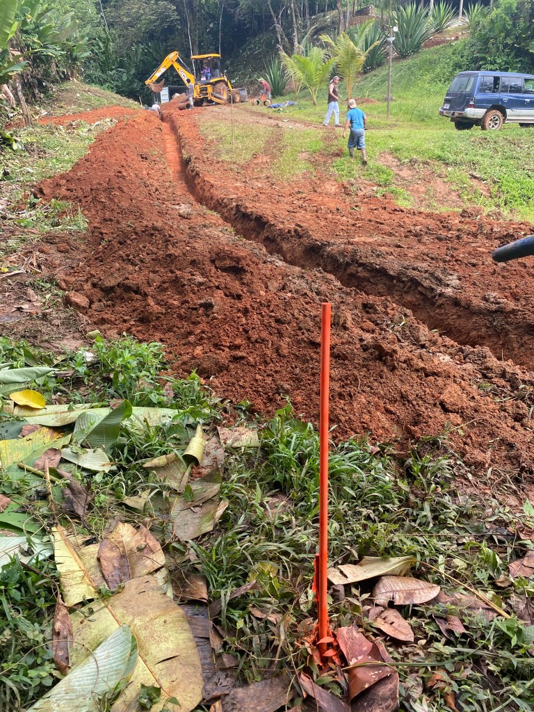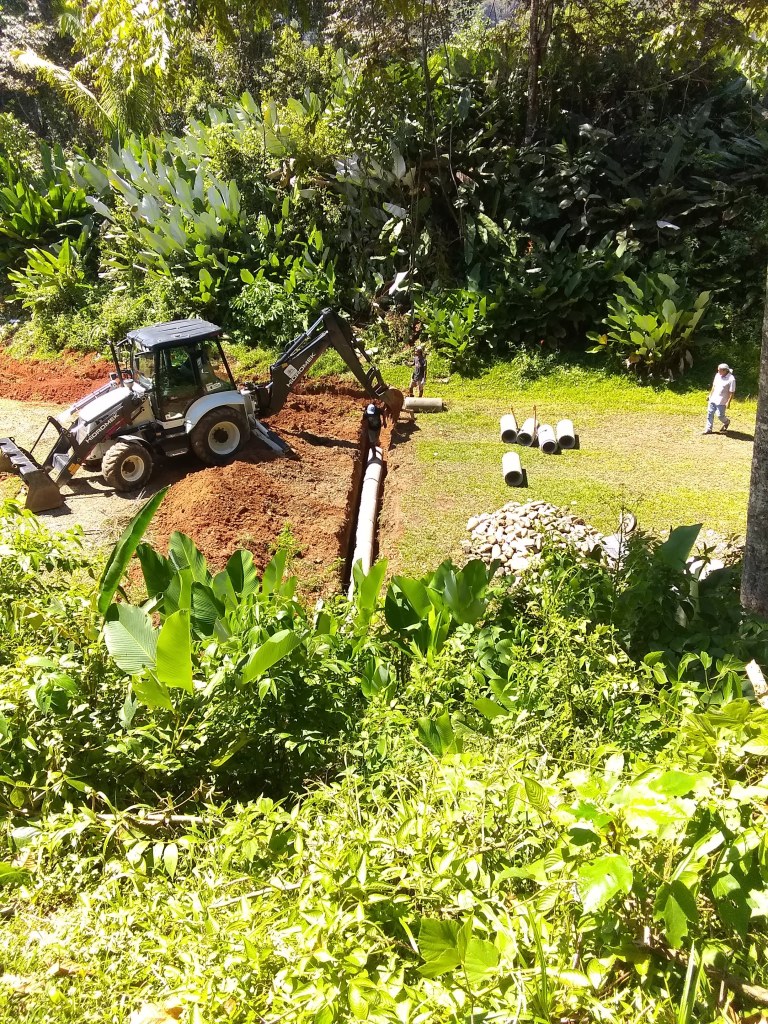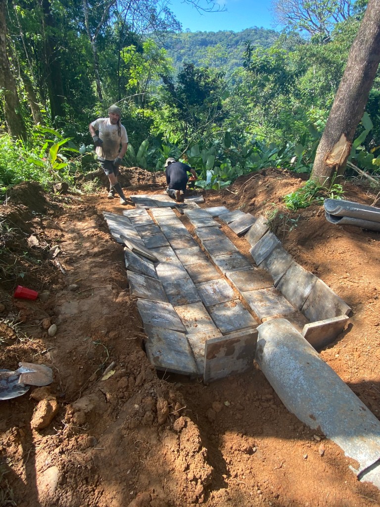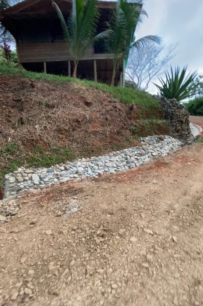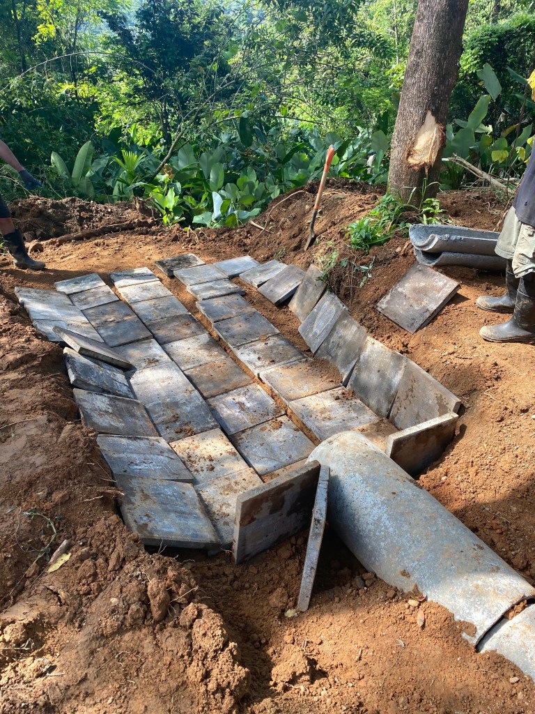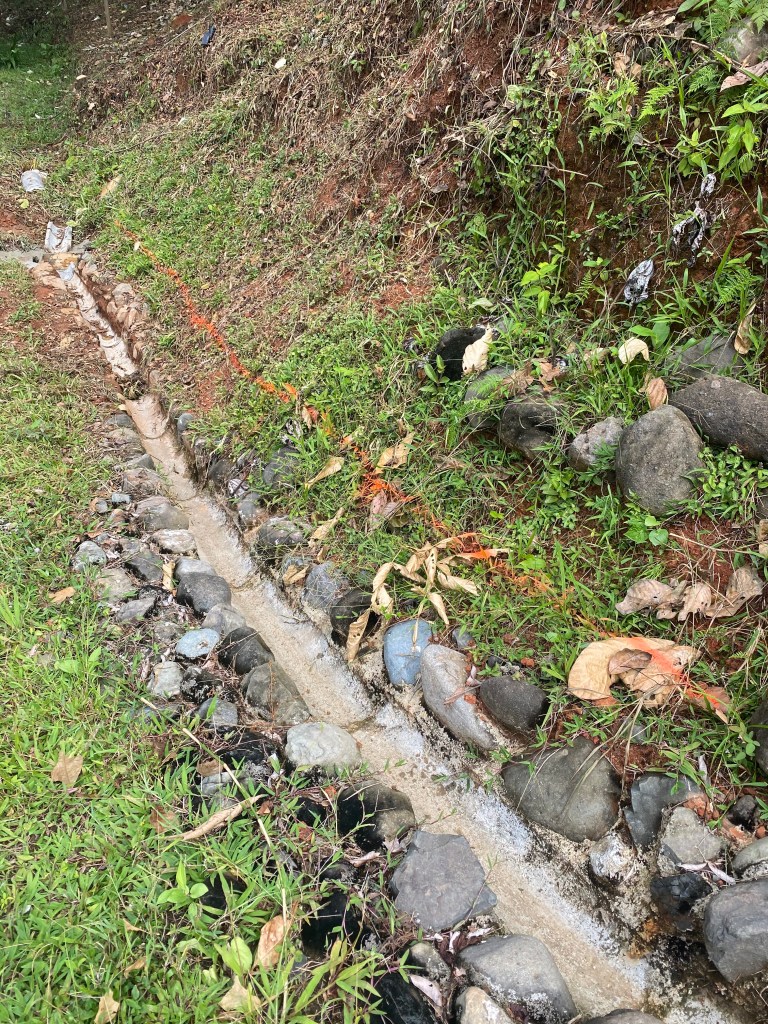 At the end of this trench line, a concrete connector box was constructed so that the alcanterias could round a corner and turn 90 degrees to keep pushing the water further down to lower levels of the property. Our original plan was to continue to move the water toward the jungle and let the water just flow naturally. When this plan was brought to the attention of our neighbor, we had to make a significant adjustment. Our original plan, as logical and cost effective as it was, was deemed unacceptable to our neighbor, as the assumption was that the rainwater coming from our property would contaminate the water from a natural spring that is very close. This is not the case, as there is no effluent associated with this drainage coming from our land, but the situation was not worth fighting about and jeopardizing a relationship with our immediate neighbor and colleague, therefore the line of alcanterias must be extended for a significant distance beyond our original plans. In January of 2021, a total of sixty-two (62) 12-inch alcanterias were installed. As of this writing, it is estimated that 30 additional alcanterias are required to complete this section of drainage. This is a significant cost for additional materials, labor, and backhoe machine rental, but that is how life is sometimes.