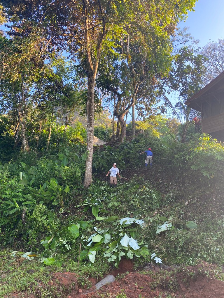 During this trip, we were fortunate to have two new guys added to the work crew, two brothers named Rabin and Marciel. Rabin and Marciel worked tirelessly to both cut down brush and trees and remove all the debris from the ground. It is customary for the most part to simply cut down the brush and let the detritus just rot on the ground. The rotting detritus may be part of nature, but in actuality this decomposing material forms a thick bed on the ground that becomes infested with all sorts of insects and other things that crawl and have venom. By using some nylon mesh tarps that we brough down with us from the States, the brothers would take load by load to the furthest downslope of the property that was away from everything that really matters. As the days passed, the property really began to shine – literally speaking, as the sun was able to penetrate areas that were previously shrouded in the jungle darkness.