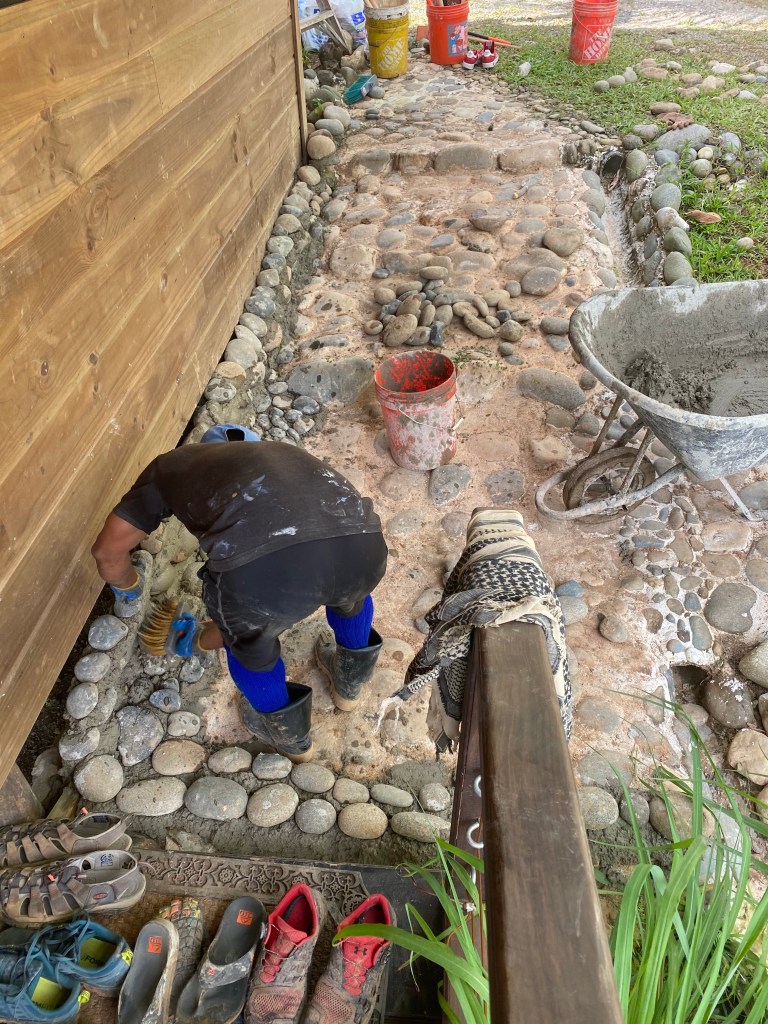 The front entrance of the property that connects the driveway to the main “Lagunas” Road had been suffering the effects of erosion for several years. During the dry season, the entrance was nothing more than a minor inconvenience of dried mud ruts and numerous bumps. During the rainy season, the entrance of the property could turn into a large puddle sometimes 4 to 6 inches deep with stagnant water that did not drain easily. To remedy this situation, a trench was dug with a backhoe and then filled with a line of 12-inch alcanterias. A total of 15 alcanterias were required for this trench line. Once the alcanterias were set into the trench, the entire trench was refilled with mud and rocks. The top of the alcanterias were then covered with 4 inches of concrete.