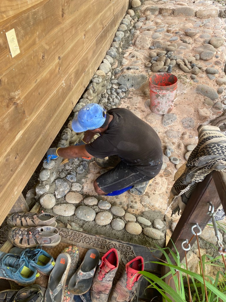 The trench line now drains to a stone-covered spill way. The skeleton of the spill way was constructed with 16x16x1.5-inch pre-cast concrete pavers, then completely covered with natural stone.