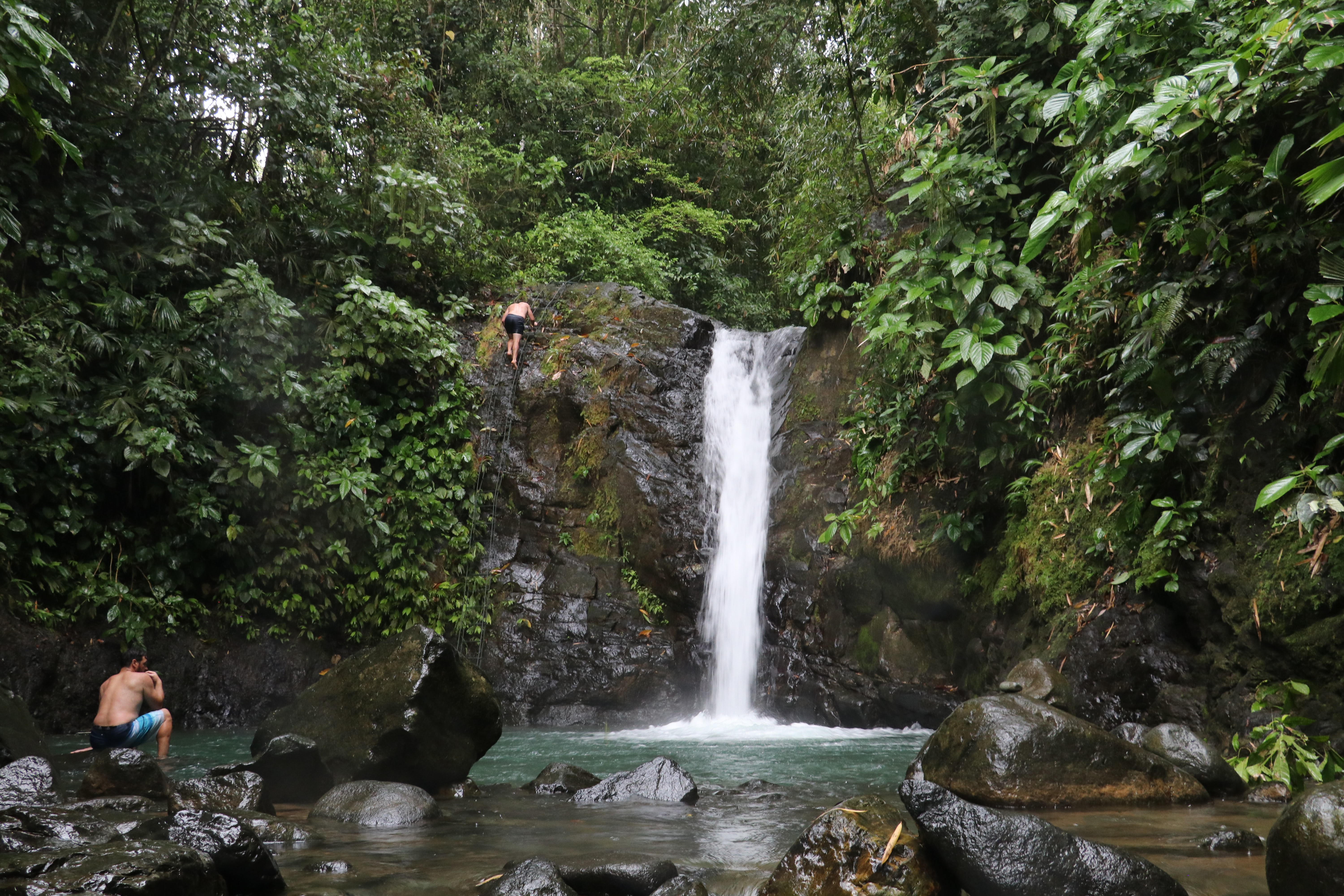 Continuing to walk along the trail will bring you to the main waterfall. This fall also functions as a waterfall slide. My first experience at this waterfall was being by myself one early morning, then increasingly new travelers showed up until there was a large group of maybe 30 people or so. A mixture of locals and 2019 Envision travelers. What I originally thought was just a beautiful and tranquil waterfall in the jungle suddenly transformed into something else. There was another side trail that leads up to the top of the main cascade. People were walking up this trail to the top of the waterfall, then sitting down in the water flow at the top of the falls and then sliding down into the pool below, a drop of maybe 25 feet. All sorts of people had the courage to slide this day. I even watched a few young American pre-teens do this with their parents. Even saw some guy go down the slide face first. Absolutely crazy to watch that. There are apparently no jagged edges on the water slide, so nothing to worry about. Right….
